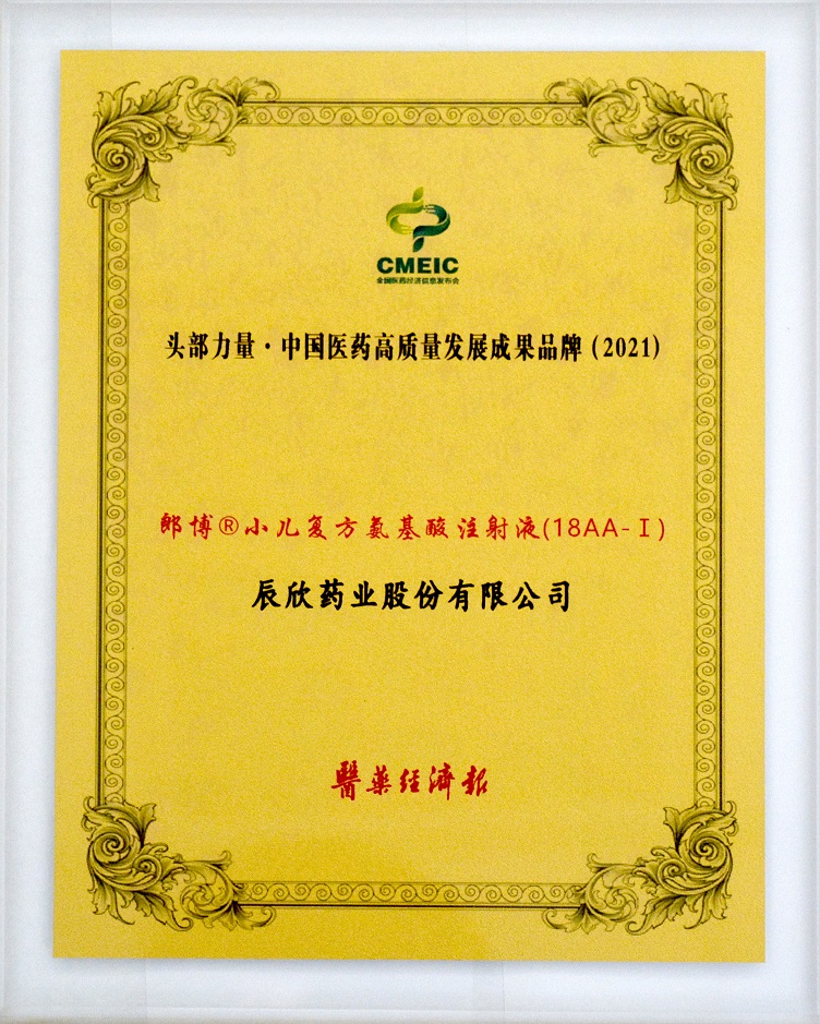 本次峰会由湖南省药品监督管理局与广东省药品监督管理局指导,医药经济报主办。会议同时发布了2021年度“头部力量·中国医药高质量发展成果企业”、“头部力量·中国医药高质量发展成果品牌”和“医药互联网创新发展领潮企业”名单,对坚守初心、开拓前行的行业主角进行表彰。辰欣药业获评“头部力量·中国医药高质量发展成果企业”,公司产品朗博®小儿复方氨基酸注射液(18AA-Ⅰ)获评“头部力量·中国医药高质量发展成果品牌”。