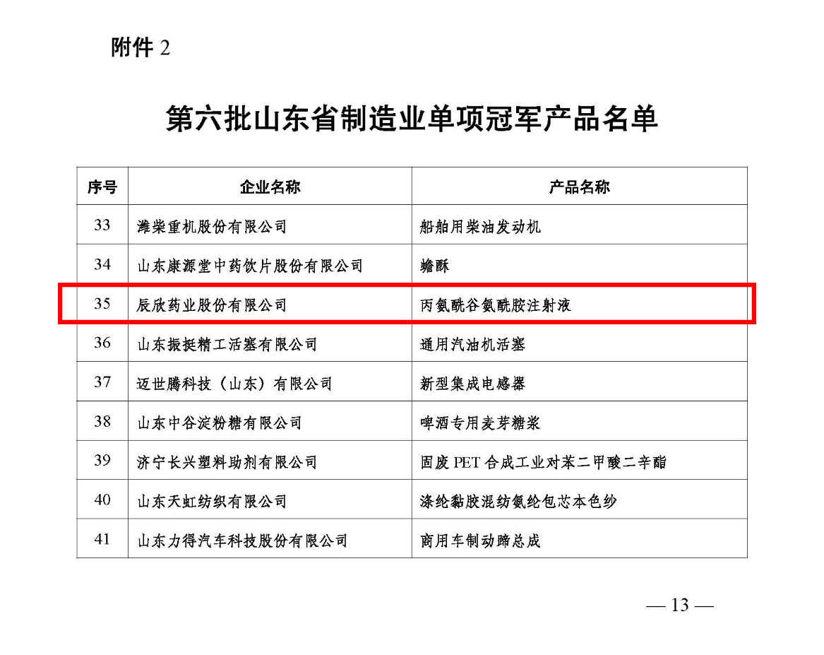 近日,山东省工业和信息化厅、山东省工业经济联合会公布了第六批山东省制造业单项冠军企业、单项冠军产品名单。经过限定性条件论证审核、行业审查、专家论证等环节、网上公示等程序,辰欣药业“丙氨酰谷氨酰胺注射液”入选山东省制造业单项冠军产品名单。
