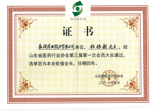 5月11日,山东省医药行业协会第三届会员大会暨全省医药工作会议在淄博召开,会议选举、产生协会新一届理事会和协会负责人,辰欣药业董事长杜振新先生当选为山东省医药行业协会第三届理事会轮值会长,任期四年。